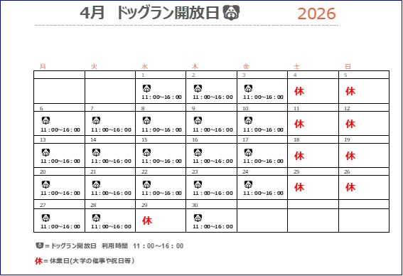 ドッグラン開放日のお知らせ(2026年 4月)